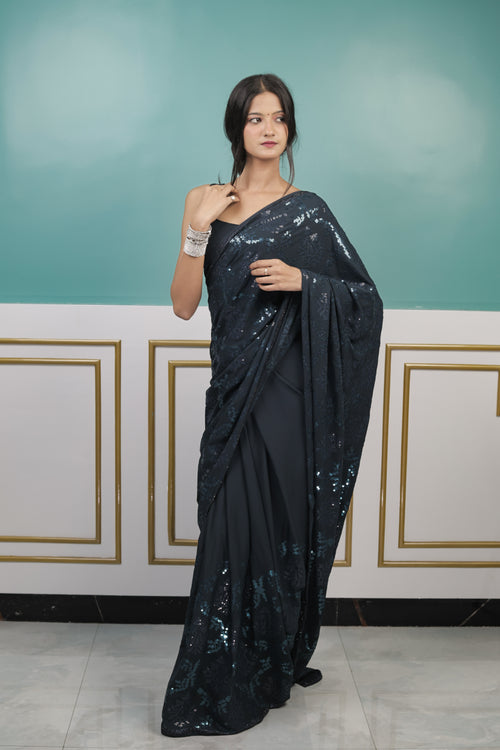 Elegant Rama Green Sequin Saree with Soft Shimmer Finish