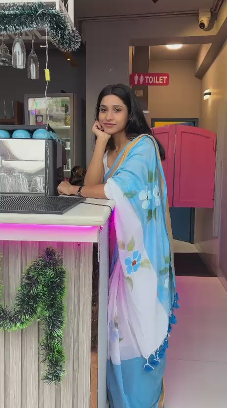 White & Blue Floral Pure Mal Cotton Saree
